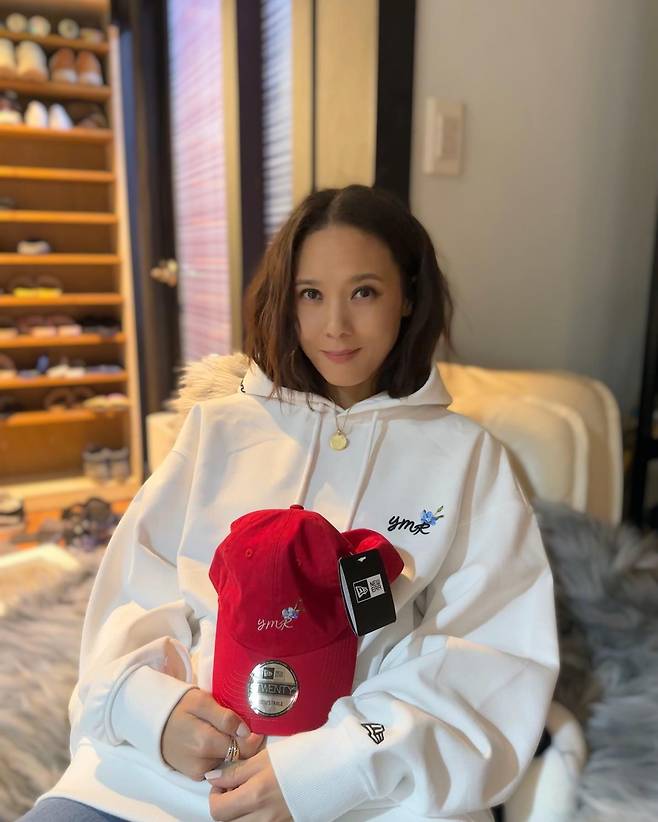 화이트 컬러의 오버사이즈 후드 티셔츠에 'ymk' 로고가 수놓아진 레드 컬러의 볼캡을 매치해 스포티한 감각을 보여주고 있다. 심플하면서도 트렌디한 스트리트 캐주얼을 완성했다.
