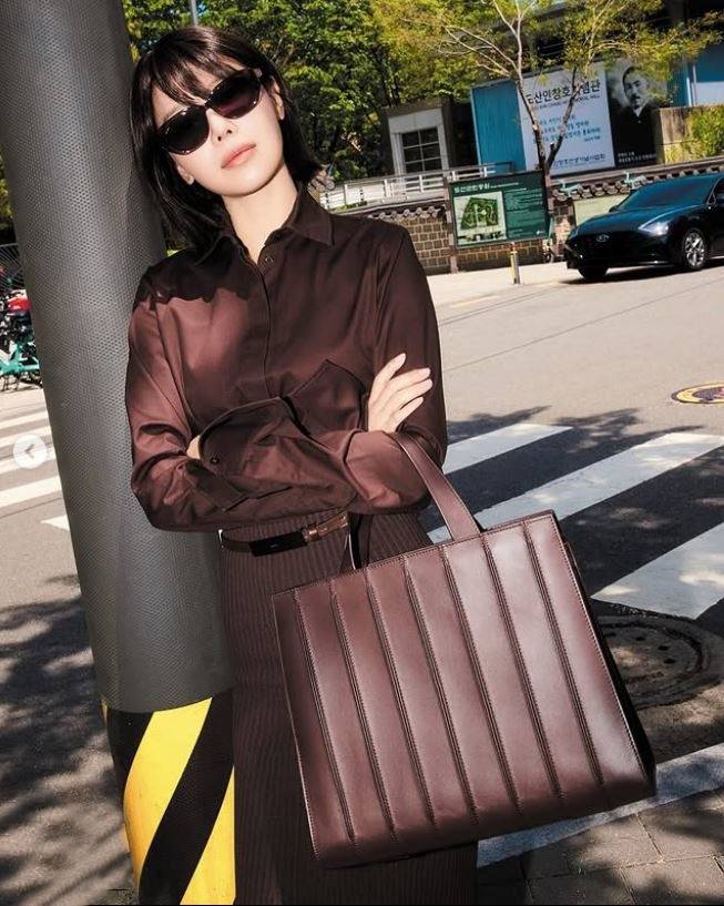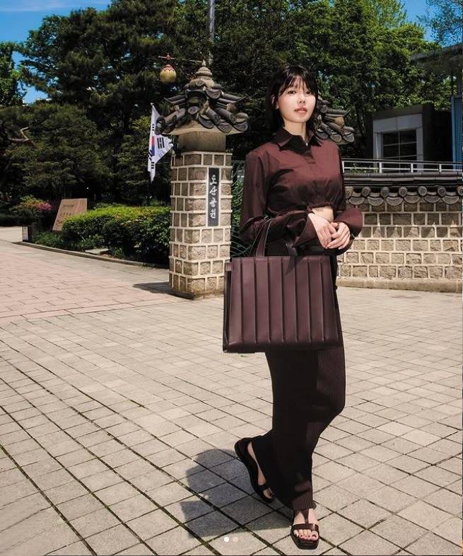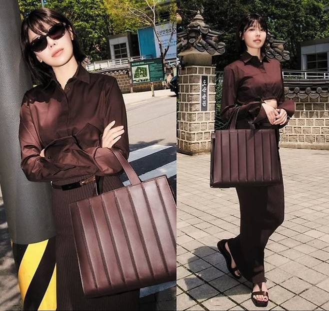 공개된 사진 속 수영은 브라운 셔츠와 팬츠, 여기에 빅 토트백까지 깔맞춤한 클래식한 스프링룩으로 외출에 나선 모습이다.