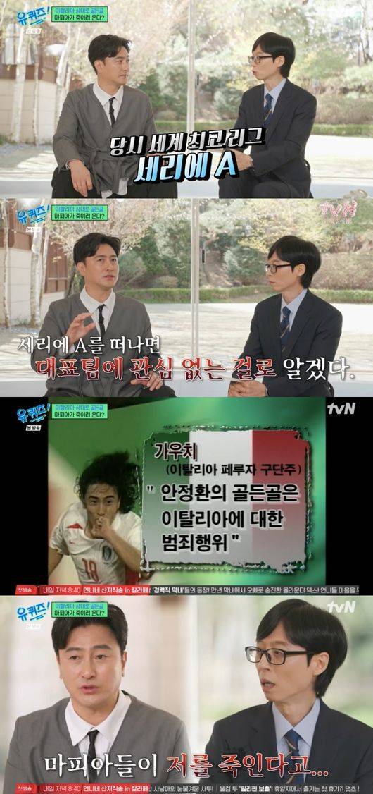 안정환은 15일 방송된 ‘유 퀴즈 온 더 블럭’에 출연해 입담을 과시했다. 안정환은 2002년 한일월드컵 16강전에서 이탈리아를 상대로 헤더로 골든볼을 넣어 국민영웅이 됐다.