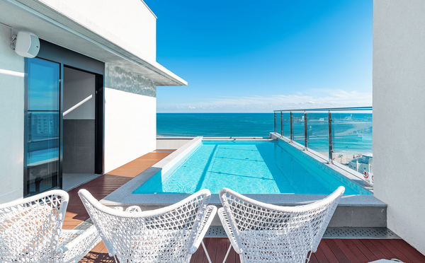 해운대구 송정 해수욕장 바로 앞에 위치한 ‘그레이샌즈 풀빌라’는 전 객실이 오션뷰로 이루어진 고급 숙소입니다. 바다와 가까운 입지 덕분에 방해물 없는 탁 트인 바다 풍경을 감상할 수 있으며, 겨울 바다의 잔잔한 매력을 만끽할 수 있습니다.