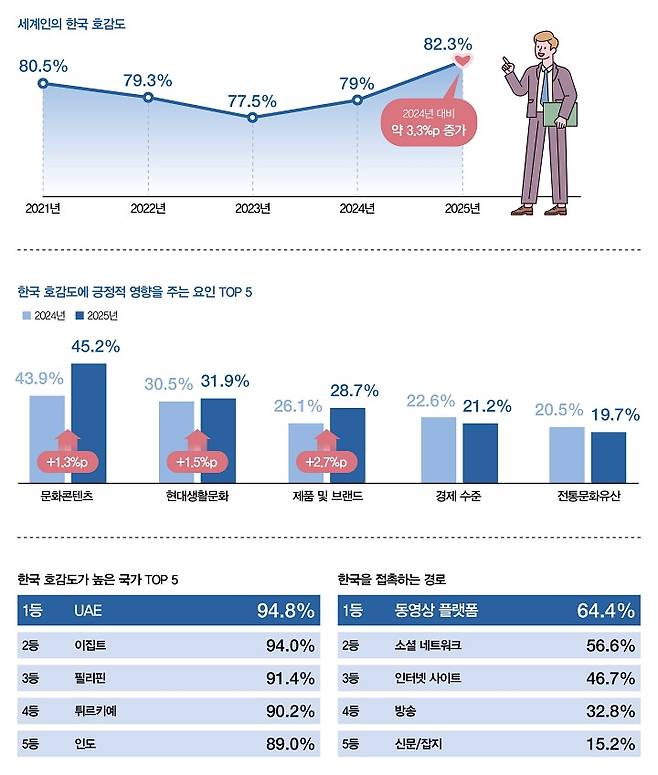 전 세계에서 바라본 대한민국의 이미지가 다시 한번 최고치를 기록했습니다. 외국인 10명 중 8명 이상이 한국에 호감을 느끼는 배경에는 K-콘텐츠를 중심으로 한 문화 영향력이 크게 작용했는데요. 2025년 국가이미지 조사를 통해 달라진 세계 속 한국의 위상을 살펴봅니다. 자세한 내용은 정책주간지 ‘K-공감’에서 확인하세요.