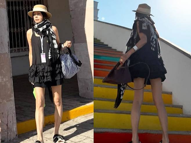 러플 디테일이 돋보이는 미니 원피스는 시원하면서도 고급스러운 느낌을 자아내며, 더운 날씨에도 스타일을 잃지 않는 남다른 패션 감각을 드러냈습니다.