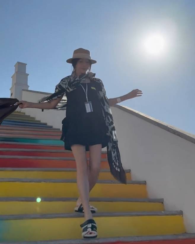 챙이 넓은 스트로 햇(모자)은 우아함을 한층 더 부각하는 역할을 했으며, 발끝을 장식한 샌들은 여유로움과 편안함을 동시에 강조했습니다.