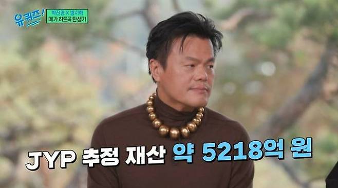 한편 박진영은 tvN 예능 '유 퀴즈 온 더 블록'에 출연해 "포브스가 추정한 박진영의 재산이 약 5218억원"이라는 조세호의 말에 고개를 끄덕이며 특별히 반박을 하지 않는 모습을 보여 '재산 5000억원설'이 불거졌었다.