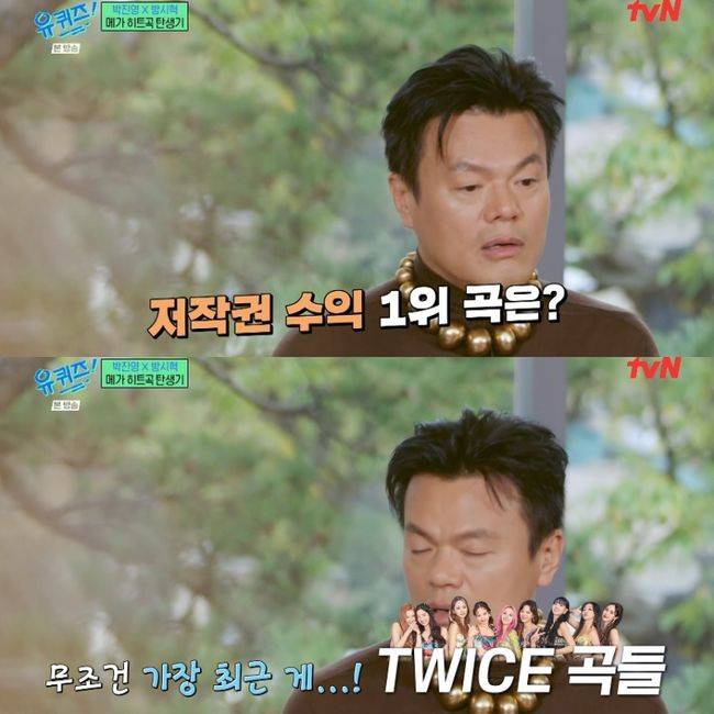 조세호가 저작권 수익 1위 곡을 묻자, 박진영은 "무조건 가장 최근 게 좋다. 트와이스 곡들. 'What is Love?', 'Feel Special'. 단위가 다르다. 말도 안 된다. 옛날에 시혁이와 '미국에서는 한 곡만 히트해도 몇십억을 번대'라고 말했던 기억이 있는데 진짜 그렇게 됐다"고 답했다.