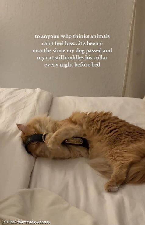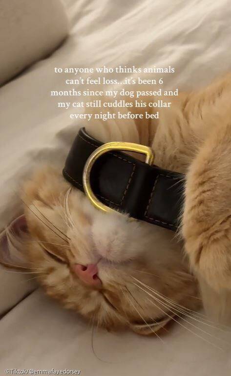 한 고양이가 세상을 떠난 리트리버 형제가 남긴 목줄을 껴안은 모습이 눈물샘을 자극합니다.