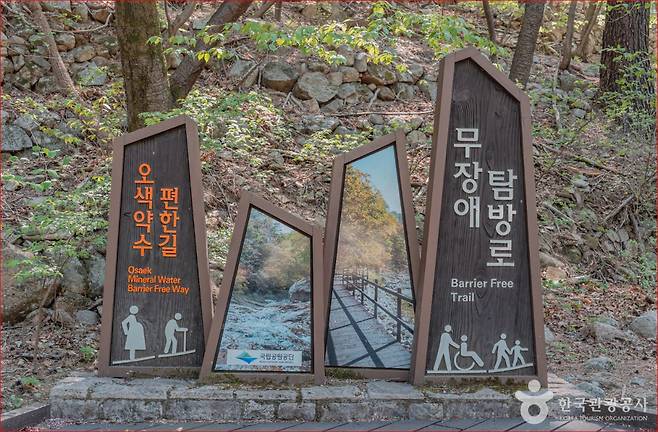 코스는 전체적으로 완만해 누구나 부담 없이 걸을 수 있습니다. 초입에서부터 시원한 탄산 맛이 느껴지는 오색약수를 맛볼 수 있어, 여행의 시작을 특별하게 열어줍니다.