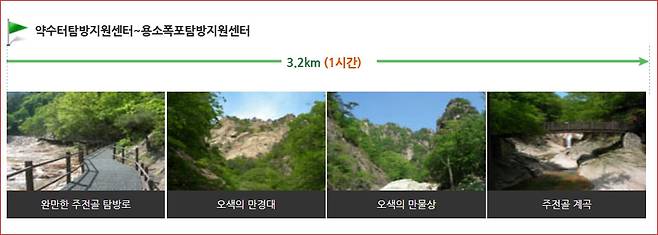 코스: 오색약수터탐방지원센터 → 성국사 → 선녀탕 → 금강문 → 용소폭포탐방지원센터