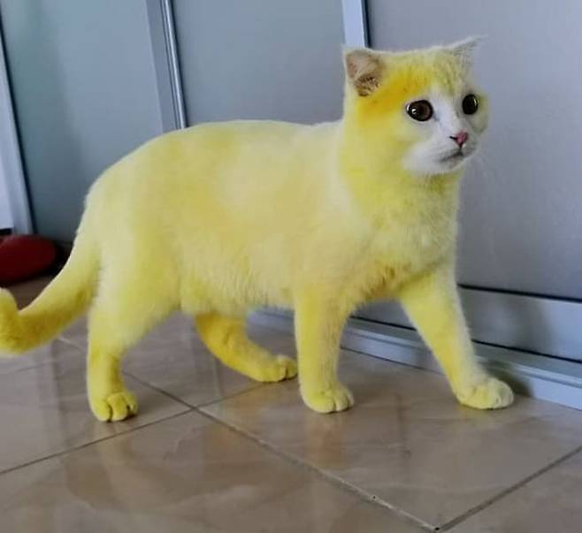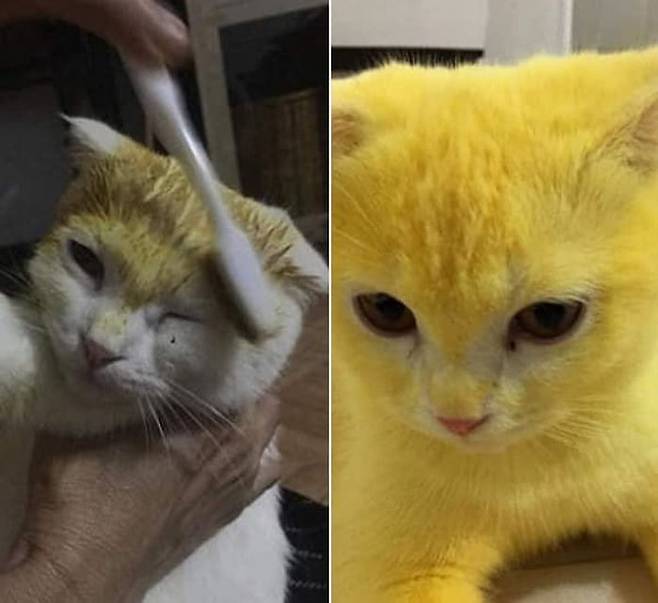 다만 문제는 강황 가루가 노란색이 아주 진해서 새하얗던 고양이의 털에 착색되어 온몸이 샛노랗게 물들어 버렸던 것이 아니겠습니까.