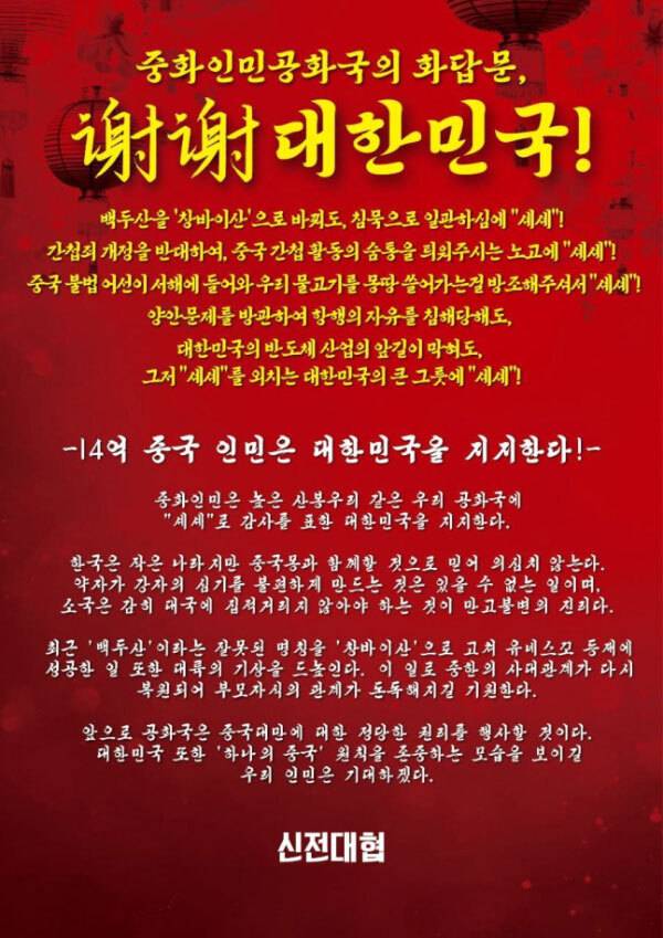 또 “백두산을 ‘창바이산’으로 바꿔도 침묵으로 일관하심에 셰셰”, “간첩죄 개정을 반대해 중국 간첩 활동의 숨통을 틔워주시는 노고에 셰셰”, “중국 불법 어선이 우리 물고기를 몽땅 쓸어가는 걸 방조해주셔서 셰셰” 등 비꼬는 내용도 있다.