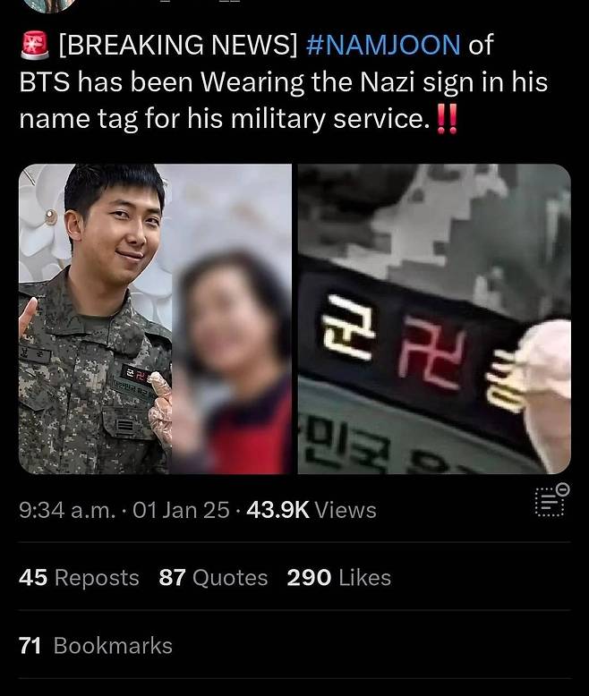 외국인이 방탄 알엠 군복에 있는 불교문양을 보고 나치문양 착용했다고 글 올렸다가 욕먹음