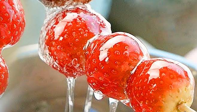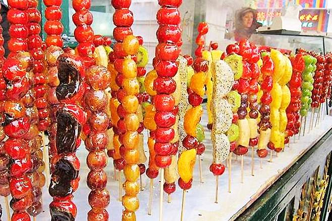 탕후루는 각종 과일을 꼬지에 꽂아 설탕물이나 물엿에 발라 굳혀 먹는 중국 전통 간식입니다.