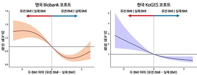 연구팀은 영국 바이오뱅크 코호트로부터 약 38만 명, 국내 KoGES 코호트로부터 약 7만 명의 임상 데이터를 확보했다. 이 데이터로부터 DNA 전장유전체 데이터를 추출, ‘타고난 비만’ 수준을 가리키는 유전 BMI 값을 산출했다. 이후 유전 BMI 값과 대상자들의 실제 측정된 BMI 값을 비교해 제2형 당뇨의 발병 위험을 분석했다.