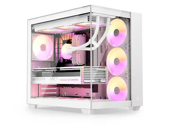 케이스로는 깔끔한 디자인의 '앱코 UD50 블루웨일 ARGB BTF’를 사용했다. 고급스러운 화이트 색상을 적용한 본 제품으로 듀얼 챔버 방식으로 뛰어난 확장성을 자랑할 뿐만 아니라 고성능 PC 빌드를 위한 설계를 통해 효율적인 쿨링과 깔끔한 케이블 정리가 가능하여, 쾌적한 조립 환경을 제공한다. 세련된 디자인과 파노라믹 뷰 구조의 어항 케이스로 데스크테리어 스타일링에 효과적이며, 외형 뿐만 아니라 시스템 구성을 들여다볼 수 있는 파노라믹 뷰 구조에 적합하도록 BTF 히든커넥터 메인보드를 호환해 손쉬운 선 정리로 조립이 간편하다.