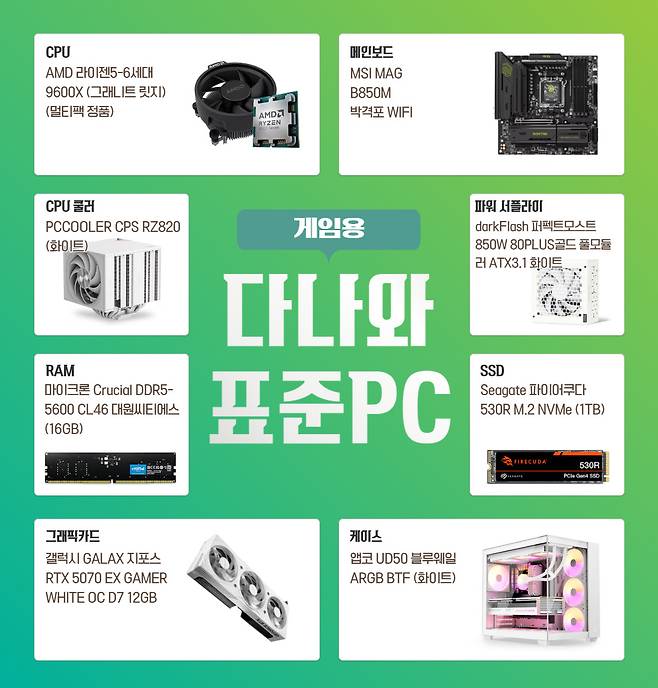 다나와가 제안하는 7월의 게임용 표준PC가 바로 그러한 제품이 아닐까 한다. 성능과 안정성, 디자인까지 다양한 요소를 만족시키는 본 제품은 뛰어난 멀티 코어 효율에 AI에 최적화된 기능으로 무장한 CPU를 필두로 QHD급의 해상도에서 게임과 고화질의 영상을 두루 즐길 수 있는 그래픽카드, CPU의 열을 빠르게 식혀주는 쿨러와 높은 가성비를 자랑하는 메인보드를 탑재했다.
