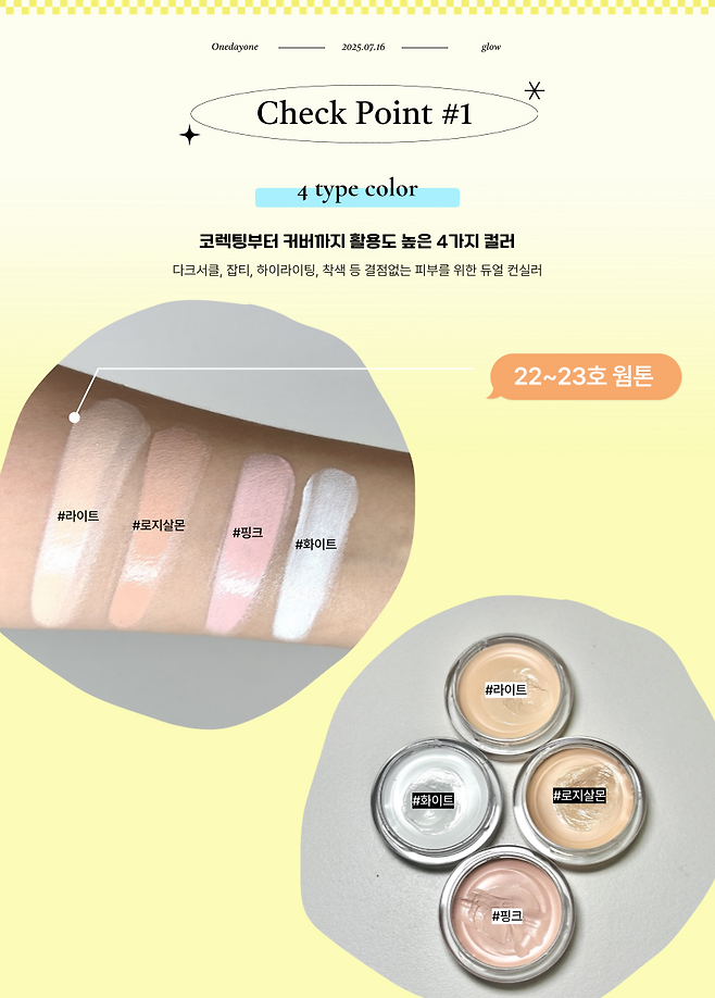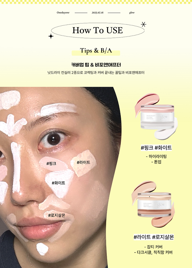 글로우 낫 드라이 컨실러 2종은 각각 #라이트 #로지살몬 / #핑크 #화이트4가지로 출시되어 다크서클, 잡티, 착색은 물론 하이라이팅까지 가능한 제품이다.