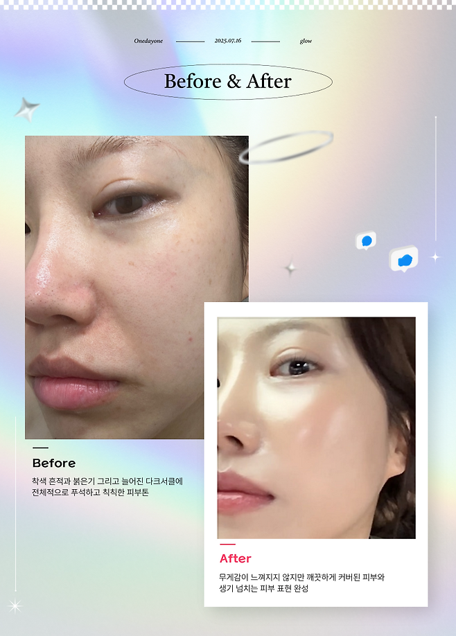 얇게 바른 건데도 커버력도 꽤 있어서, 웬만한 홍조나 피부톤 커버는 가능하다. 무너짐 없이 오래 유지되고, 무엇보다 피부가 너무 편해!
