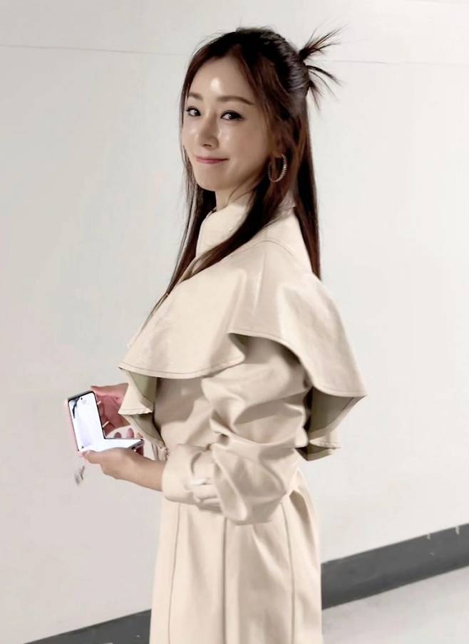 배우 오나라가 크림 가죽 셔츠 원피스로 웜톤녀의 멋스러운 가을룩을 완성했다.