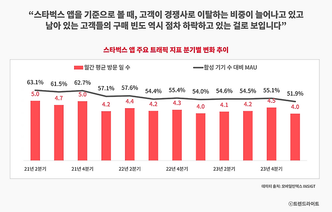 그런데 최근 스타벅스의 회전율을 책임지던 로열티 고객 층에서 일부 균열이 발생하기 시작했습니다. 사실 이러한 로열티 고객들을 집중적으로 관리하는 것이 바로, 스타벅스 리워드 멤버십인데요. 특이하게도 스타벅스 앱의 주요 지표들을 보면, 스타벅스 리워드의 현재 상태를 진단할 수 있습니다. 스타벅스 별 적립은 물론, 핵심 프로모션인 프리퀀시 이벤트 또한 앱에서 진행되기 때문인데요. 작년부터 불거지기 시작한 문제는 앱의 월간 평균 방문 일수가 서서히 떨어지고 있다는 겁니다. 더욱이 아예 활성 기기수 대비 MAU(월간 활성 이용자 수) 비중 또한 하락세에 있는데요. 이는 결국 핵심 고객층이 얇아지는 동시에, 일부 고객들은 아예 스타벅스를 떠나고 있다는 걸 뜻합니다.