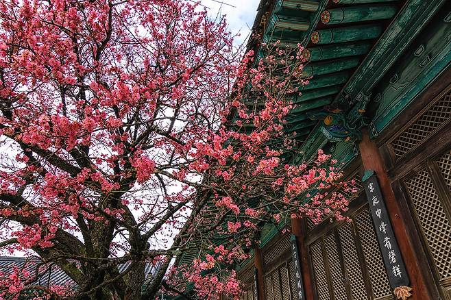 사진을 찍을 때는 사찰의 건물과 함께 프레임을 잡는 것이 좋다. 고풍스러운 기와지붕과 홍매화가 어우러지면 한 폭의 동양화 같은 장면이 연출된다.