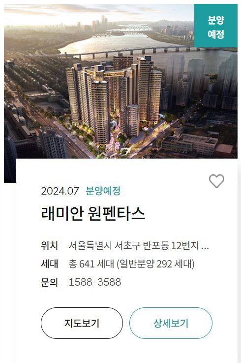 래미안 원펜타스는 서울 서초구 반포동 신반포15차아파트를 재건축한 아파트다. 지하 1층~지상5층 규모 8개동 180가구였던 아파트는 재건축 후 지하 4층~지상 35층 6개동 641가구로 탈바꿈한다. 이중 292가구를 일반분양한다. 전용면적별 ▲59㎡ 37가구 ▲84㎡ 215가구 ▲107㎡ 21가구 ▲137㎡ 11가구 ▲ 155㎡ 4가구 ▲191㎡ 4가구다.