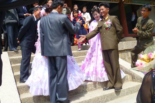 평양에 거주하는 중상류층은 음식점에서 결혼식을 올리고 정장과 웨딩드레스를 입습니다. 예술인을 초청해 공연을 진행하기도 하죠.