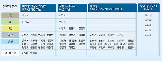 친이재명계는 지근거리에서 이 의원을 보좌하는 측근 그룹, 여의도에서 이 의원을 돕는 의원 그룹으로 구분할 수 있다. 특히 이 의원 국회 입성 이후 새롭게 불어난 그룹이 ‘신친명’으로 불리고 있다.