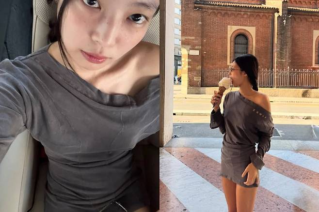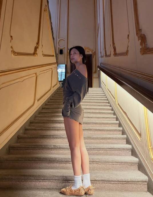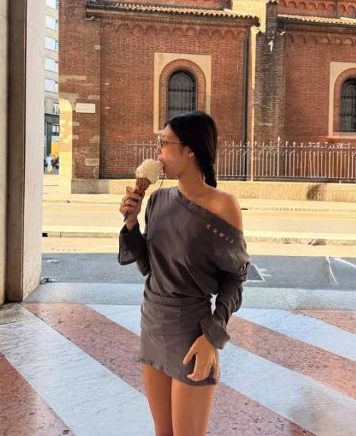 제니는 무채색 원피스 형태의 오프숄더 톱을 선택해 절제된 분위기를 연출했습니다. 부드러운 회갈색 컬러와 비대칭 네크라인 덕분에 과하지 않으면서도 어깨 라인이 자연스럽게 강조됐는데요.