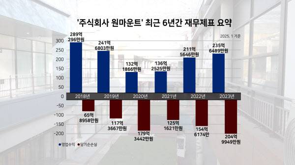 금융감독원 전자공시시스템에 따르면 원마운트 순매출액인 영업수익은 2019년 241억원에서 2020년 132억원으로 반토막났다. 이듬해인 2021년에도 136억원에 그쳤다. 코로나19가 끝난 이후인 2022년에는 2011억원, 2023년에는 235억원으로 살아났으나, 당기순손실이 200억원(2023년 기준)으로 역대 최대를 기록했다.