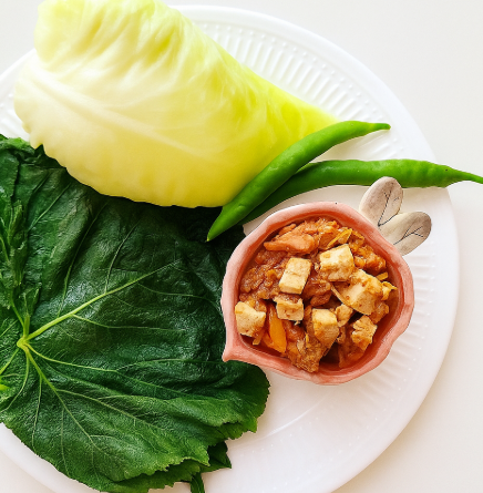 쌈채소 위에 밥 한 숟갈, 그 위에 두부참치쌈장을 올리고 돌돌 말아 드세요.