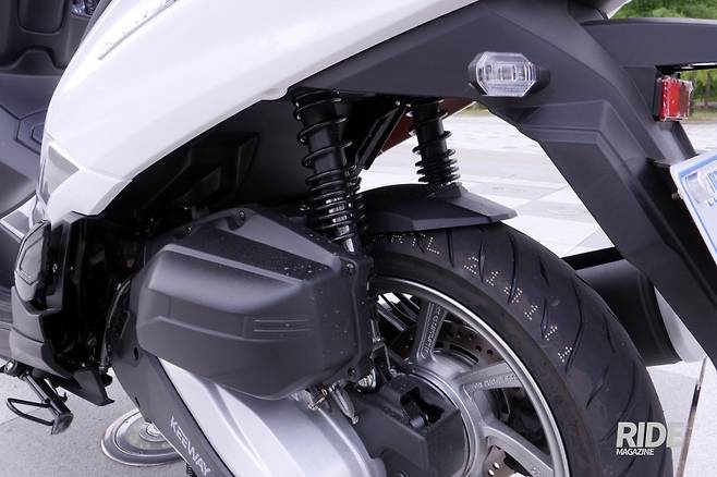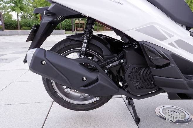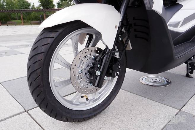브레이크는 앞뒤 모두 디스크 방식에 2채널 ABS로 장착을 했는데 우리나라 소비자들 눈들이 워낙 높아져 이제 ABS도 2채널 아니면 도무지 만족을 못하는 것 같다. 덕분에 제동 성능은 충분히 넉넉하다. 부드럽게 잡거나 급하게 잡거나 만족스러운 제동성능을 보여주는데 이 정도 스쿠터 모델에 이 정도 브레이크 성능이면 만족할만한 수준이다. 그리고 조절식 브레이크 레버로 라이더의 손 크기에 맞춰 간격을 조절할 수 있다는 점도 나름 마음에 든다.