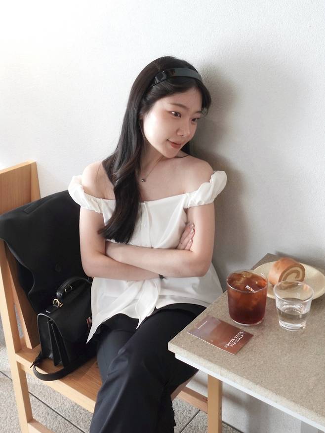 이번에는 포인트 디테일이 더해진 오프숄더 블라우스를 소개할게요.