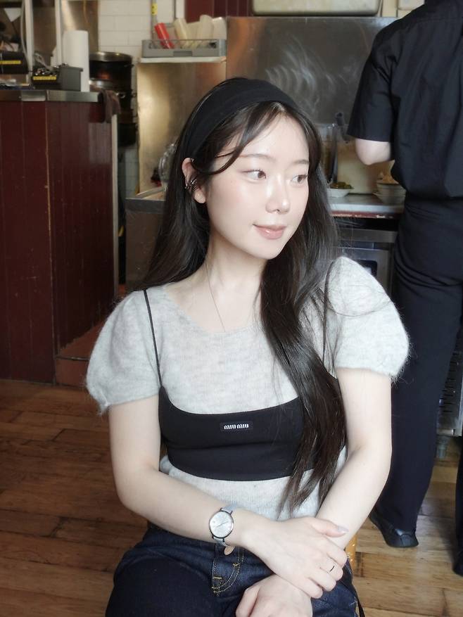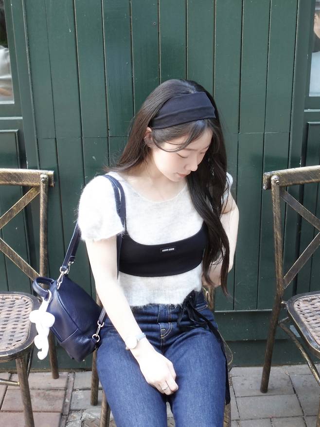 뷔스티에를 위에 겹쳐 입으면 레트로하면서도 하이틴스러운 룩이 완성되는데요,