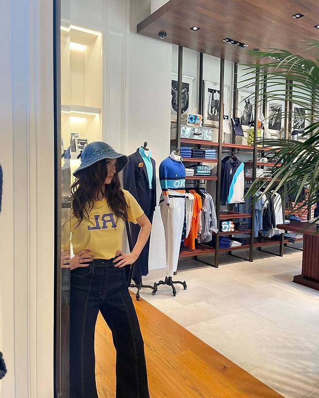 사진 속 정수정은 노란 반팔티와 청바지를 입고 청모자를 써서 캐주얼한룩을 선보였다.