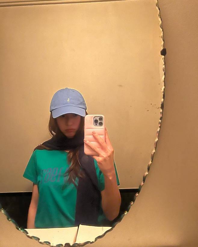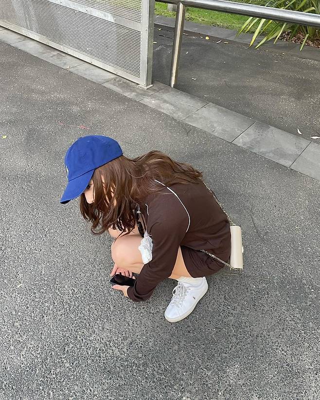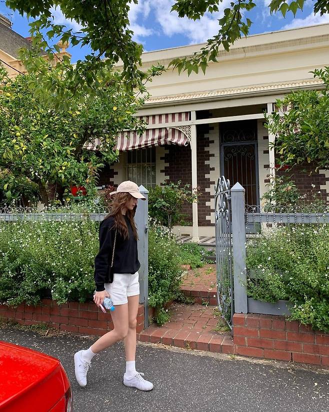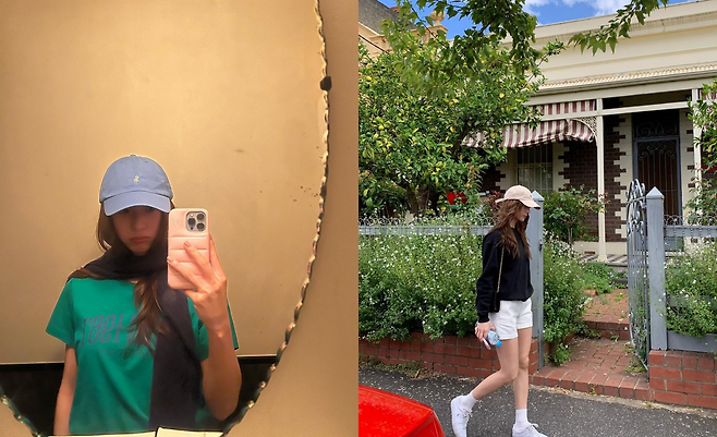 사진 속 정수정은 블랙 티에 흰색 짧은 반바지를 입고 캡모자를 써서 캐주얼한룩을 선보였다. 또 다른 사진에서는 그린색 반팔티와 캡모자와 블랙티와 반바지, 블루톤 캡모자를 써서 긴기럭지를 자랑했다.