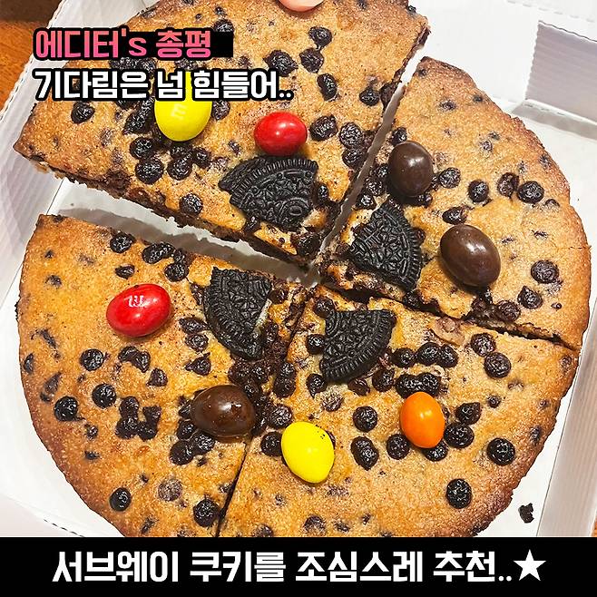 하지만, 가격이 넘나 비싸다는 거..? 그리고 무엇보다 주문을 하고 50분씩이나 기다리면서 먹을 맛은 아니라고 생각했어요ㅜㅜ 요 정도라면 그냥 서브웨이 쿠키를 먹는 게 좋을 것 같다는 밥심의 주관적인 생각입니다!