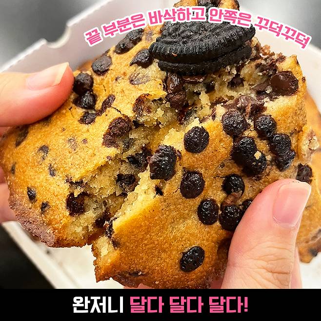 옆면은 요래 보이네요. 안쪽에 초코칩이 정말 사정없이 퍼져있어요. 초코 하나만은 아끼지 않은 거 인정!
