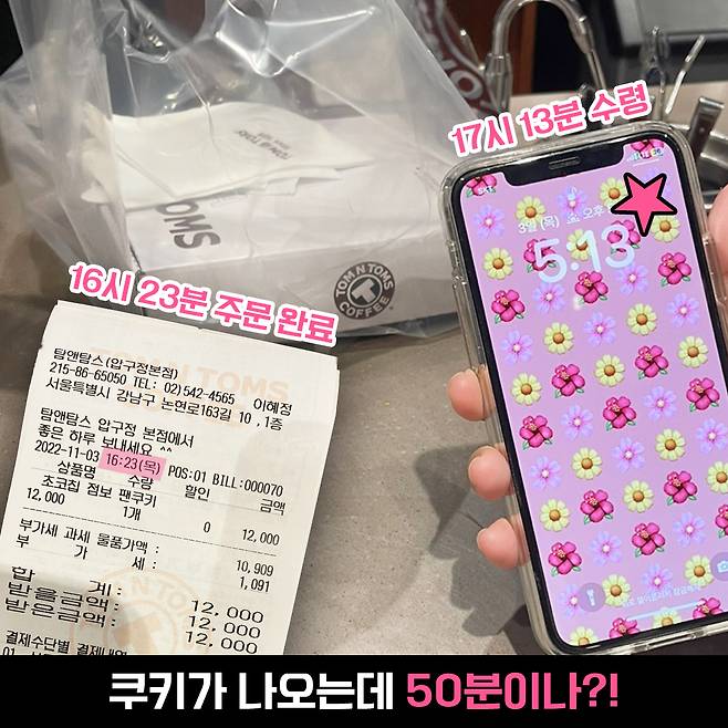 제가 주문한 시각 보이시나요? 16:23분에 결제를 했는데요. 나온 시각은 5시 13분ㅠㅠ. 정확하게 50분 뒤에나 받을 수 있었어요.