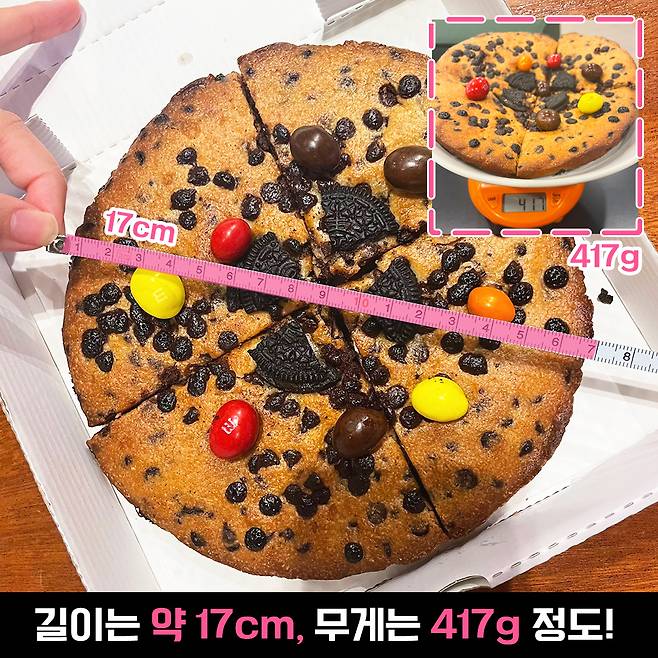 무게는 417g으로 꽤 무거운 편이었어요. 요게 사진으로는 크기가 잘 안 담겨서 '그래서 이게 얼마나 큰 거야?!'라고 하실 분들이 있을 것 같아서 탐탐에 파는 다른 쿠키와 비교해보았습니다.