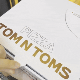 매장에서 드시면 팬에 담겨 제공되고, 포장할 때는 피자 박스처럼 생긴 종기 박스에 제공됩니다! 마치 피자를 연상시키는 비쥬얼이죠?