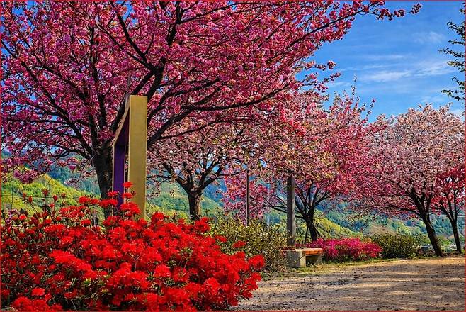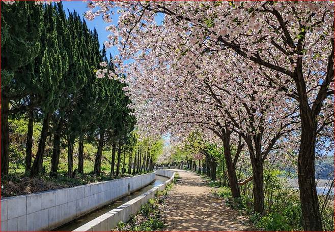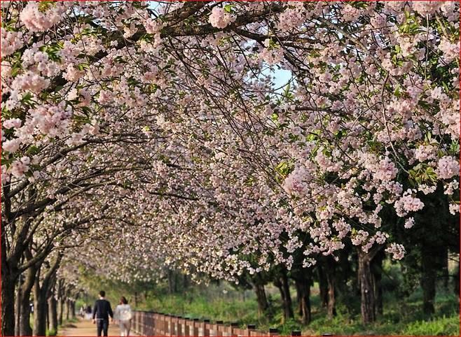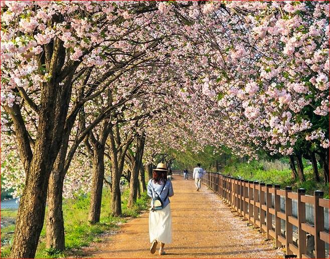 사진 포인트: 평화로운 논밭을 배경으로 겹벚꽃 나무를 단독으로 찍거나, 수로를 따라 길게 뻗은 꽃길의 소실점을 잡아 찍으면 인생 사진을 건질 수 있습니다.