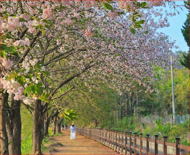 겹벚꽃은 일반 벚꽃보다 꽃송이가 크고 풍성해 나무 한 그루만으로도 묵직한 존재감을 뽐내는데요. 길을 따라 식재된 나무들이 일제히 꽃을 피우면 화려한 분홍빛 물결이 장관을 이룹니다. 중간중간 마련된 벤치와 포포존에서 쉬어가며 이 아름다운 풍경을 눈과 사진에 가득 담아보세요.