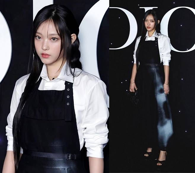 19일(현지시간) 에콜 밀리테르(Ecole Militaire) 별관에서 개최된 디올의 남성복 패션쇼 장에 해린은 화이트 셔츠와 아티스트 작업복에서 영감을 받은 블랙 원피스를 레어어드한 블랙앤화이트룩으로 등장과 동시에 환호를 받았다.