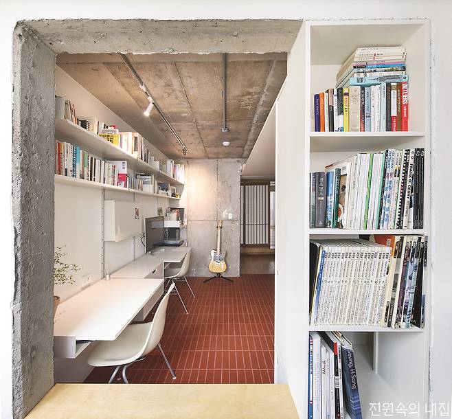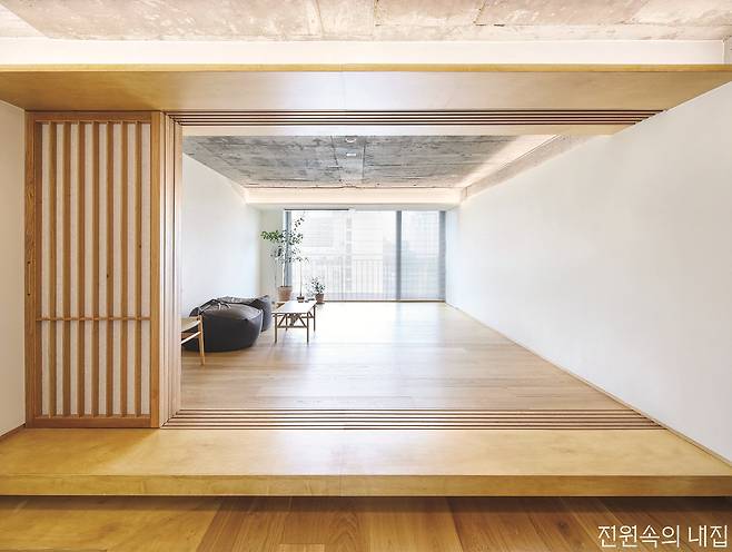 국정 씨는 ‘집’일수록 오히려 비일상적 요소를 지녔으면 한다고 전했다. 석고보드를 들어내고 노출한 벽과 천장, 그리고 거실 전체의 단을 200mm 올려 만든 마루의 특별한 공존은 그렇게 시작되었다.