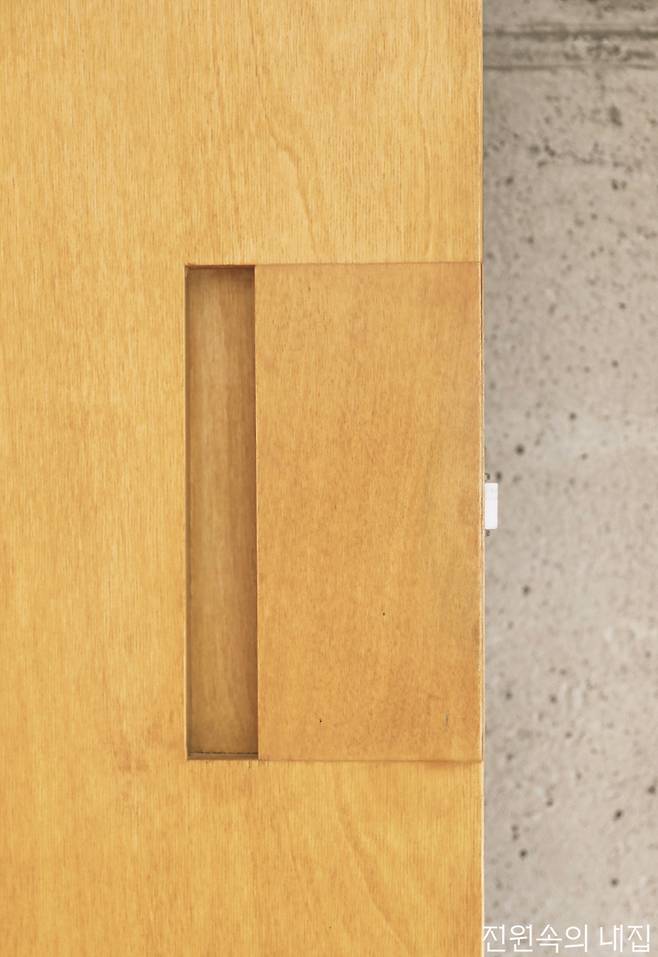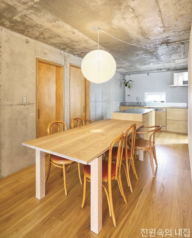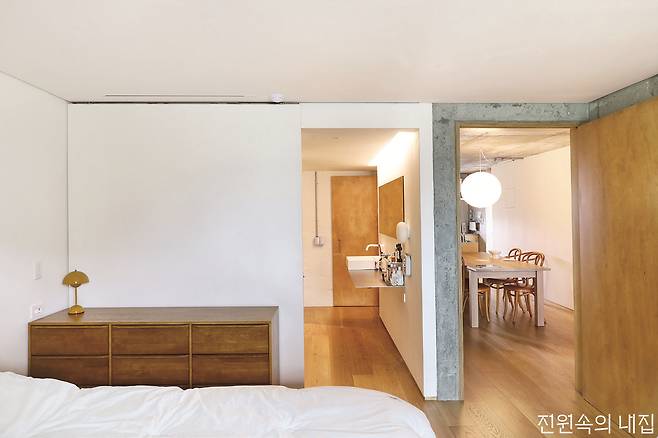 주방을 중심으로 순환 동선을 이루는 평면 구성에도 많은 공을 들였다. 가족들이 만드는 ‘행동의 스토리’를 평면에 녹여냈다. 서재의 캣타워를 통통거리며 내려오는 고양이의 발걸음 소리는 단단한 타일 바닥을 지나, 한지 문 너머 마루까지 이어지며 일상의 한 장면을 입체적으로 만든다. 눈에 보이지 않아도 그들의 스토리 라인을 생생하게 그려볼 수 있다. 여기에 주방에서 안방, 화장실이 하나로 연결되는 동선은 기존의 안방 욕실과 공용 욕실을 하나로 터서 완성할 수 있었다. 유배 씨가 집에서 가장 좋아하는 장면은 바로 여기, 주방 테이블에 앉아 바라보는 집과 가족이다.