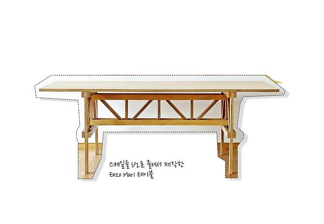 첫 번째로 비초에의 606선반. 홈페이지에서 60년 동안 비초에의 선반을 쓰고 계신 노부부의 영상을 보고 감명을 받았습니다. 우리도 앞으로 60년 넘게 대물림할 수 있는 가구로 사용하고 싶습니다. 선반을 주문하던 당시, 마침 원하던 구성의 일부 모듈을 중고로 구입할 수 있어서 좋은 가격에 선반을 완성하게 됐어요. 두 번째로는 스케일을 1/2로 줄여서 직접 제작한 엔조 마리의 테이블이 마음에 듭니다.