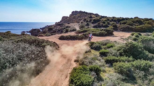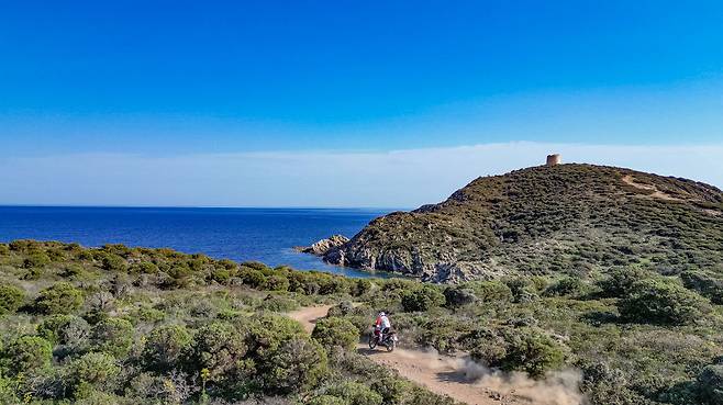 양 사르데냐 섬에 웬 코너가 그렇게 많은지. 웬만한 코너는 모두 타이트하게 느껴질 정도로 주행 페이스가 엄청 빨랐어요. 휠이 큰 만큼 바이크가 돌아나가는 속도가 비교적 느린데 그만큼 라이더가 느낄 수 있는 여유가 있어요. 머리가 휙 돌아나가지 않기 때문에 내가 뒤에서 기다리며 같이 도는 느낌, 뭔가 바이크를 조작한다는 느낌을 더 줬던 것 같아요.