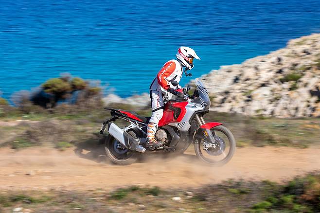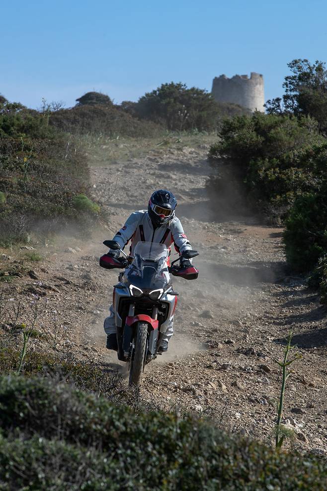 온로드 성능은 만족스러웠지만 이 바이크는 어드벤처 바이크인 만큼 오프로드를 달려봐야 진가를 알 수 있다. 우선 가볍게 로드 타이어 상태로 비포장도로를 달렸다. 순정 서스펜션 성능이 꽤 괜찮다. 작은 요철부터 큰 요철까지 잘 대응하면서도 부유하는 느낌 없이 노면을 잘 느끼게 해준다. 오프로드에서도 시원시원한 가속이 이어진다. 변속 없이 가속하며 8,000rpm을 넘기면 오묘한 느낌이 든다. 슈퍼바이크의 하울링 소리를 내며 오프로드를 달려가고 리어의 접지감이 희미해지는데 속도는 무섭게 붙는다. 지금까지 경험해보지 못한 스타일의 라이딩이다. 리어의 미끄러짐이 있어도 자세가 틀어지는데 여유가 있어서 조급한 움직임은 나오지 않는다. 대응하기 쉽다는 말이다.