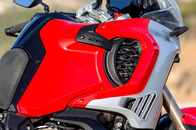 첫인상은 익숙하다. 초기 한정판으로 공개된 LXP 9.5 오리올리와 동일하고 옵션과 컬러나 일부 소재만 변경됐을 뿐이다. 레드와 실버가 조합된 페어링은 F4, F3 혹은 슈퍼벨로체가 떠오른다. 고급스러움과 깔끔함, 이탈리아 브랜드 특유의 열정적인 분위기까지 고스란히 담겨 있다. 사이드 페어링 안쪽에 동그란 배기구가 절반만큼 드러나 있는데 실제로 라디에이터의 열기가 빠져나갈 수 있는 통로이면서 럭키 익스플로러의 로고의 원형을 형상화한 것이다. 과거 유산을 그대로 따른 게 아닌 현대적으로 재해석하여 잘 표현한 요소 중 하나다. 휠베이스는 1,610mm로 콘셉트 모델보다 30mm가량 길어졌다. 다른 브랜드의 오버 리터 어드벤처보다도 긴 수준인데 실제로 봤을 때의 비율은 이상하지 않다. 마음속으로 ‘살짝 긴가’ 싶은 생각이 스치는 정도다.
