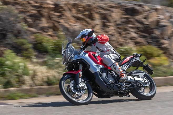 시동 소리는 기존의 MV 아구스타 3기통 모델과 흡사하다. 스로틀 반응이 살짝 더 느긋할 뿐 긴장감을 주기엔 충분하다. 바이크를 밀고 끌 때까지는 미들급인가 리터급인가 고민이 들었는데 움직이기 시작하면 분명 미들급처럼 가볍다. 역회전 크랭크가 적용된 덕분에 가속 중에도 좌우 핸들링이 경쾌하다. 휠베이스가 길고 프런트 포크가 길게 뻗은 만큼 기울임이 느긋하다. 선회 방향을 바라보며 코너 안쪽에 체중을 실으면 자연스럽게 라인을 그린다. 지금까지 갖고 있던 MV 아구스타에 대한 까칠한 인상이 완전히 무너진다. 달리기 시작한 지 얼마 지나지 않아 바이크에 쉽게 적응할 수 있고 페이스를 높일 수 있다. 전후 서스펜션의 트래블은 210mm로 넉넉한 편인데 노즈 다운이 심하지 않다. 초반에 일정 이상 눌리고 나면 적절하게 버티면서 코너를 원하는 반경으로 돌 수 있게 만든다. 물론, 슈퍼바이크 같은 배기음 때문에 나도 모르게 흥분하면 회전 반경이 시원하게 커진다. 90kg의 라이더 기준으로는 차량의 출력과 타이어 그립에 비해 리어 쇽의 프리로드가 약한 편이다. 반대로 얘기하면 투어링을 즐기는 대부분의 라이더에겐 편안한 세팅이란 뜻이다. 순정 브리지스톤 A41 타이어를 사용한 적이 있다면 알겠지만, 그립이 아주 훌륭하다. 가속이나 감속 상황에서 타이어가 아스팔트를 놓치는 경우가 없다. 도로 위의 큰 범프로 인해 무게가 급격하게 실렸을 때도 불안정하지 않다. 개인적으로 21인치 휠에 가장 믿음직스러운 타이어를 꼽으라면 망설임 없이 선택할 수 있는 제품이다. 엔듀로 벨로체에 적용된 전자장비도 수준급이다. 엔듀로 벨로체는 스로틀 민감도, 최대 토크, 엔진 반응, rpm 리미터를 입맛에 맞게 조절할 수 있고 트랙션 컨트롤, 윌리 컨트롤, 엔진 브레이크 컨트롤, ABS를 단계별로 조절할 수 있다. 프리셋이 저장된 오프로드, 어반, 투어링과 더불어 모든 기능을 제어할 수 있는 커스텀 모드도 마련되어 있다.
